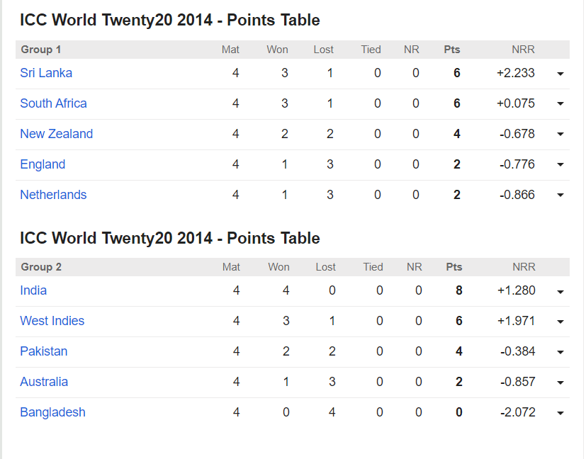 Only those matches where results are achieved will count for the purpose of net run rate calculations. Where a match is abandoned, but a result is achieved under Duckworth/Lewis, for net run rate purposes Team 1 will be accredited with Team 2’s Par Score on abandonment off the same number of overs faced by Team 2. Where a match is concluded but with Duckworth/Lewis having been applied at an earlier point in the match, Team 1 will be accredited with 1 run less than the final Target Score for Team 2 off the total number of overs allocated to Team 2 to reach the target.