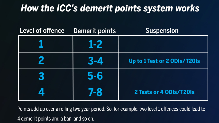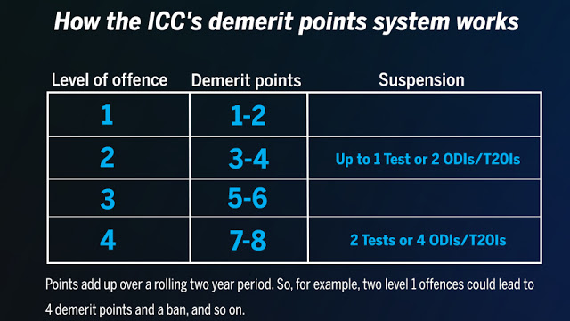 So, as you guys can see, if you get 3 or more demerit points you will be suspended for one test or 2 limited over games. This depends on the next match his team is going to have. If it is an ODI match or a T20I match, then the suspension will be 2 limited over matches and so on.