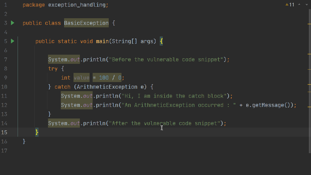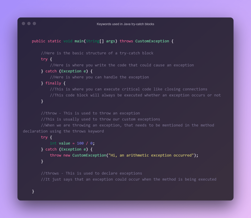 You should probably understand all the keywords and the usage from the above code snippet. Don’t be alarmed if you did not understand the CustomException part. I will be explaining how we can create our own exceptions.