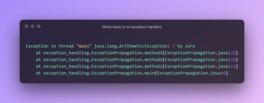 The exception is occurred inside method3. So, it checks if there is an exception handler in that method. Since there are no exception handlers in method3, it goes back to the method2 to check if there is an exception handler there. It goes searching in the call stack in reverse order until it finds an exception handler that can handle the occurred exception. If it fails to do so, the program will stop working.