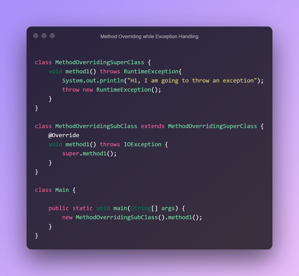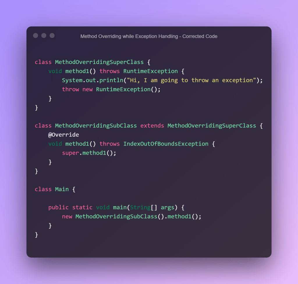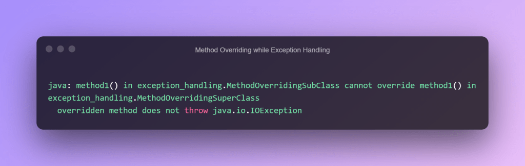 We are throwing a RuntimeException from the super class and trying to throw an IOException from the subclass. This is not allowed. We can either throw the RunTimeException or a subclass of that class from the subclass method. We can’t throw an exception that is on the same level or higher than the RunTimeException.