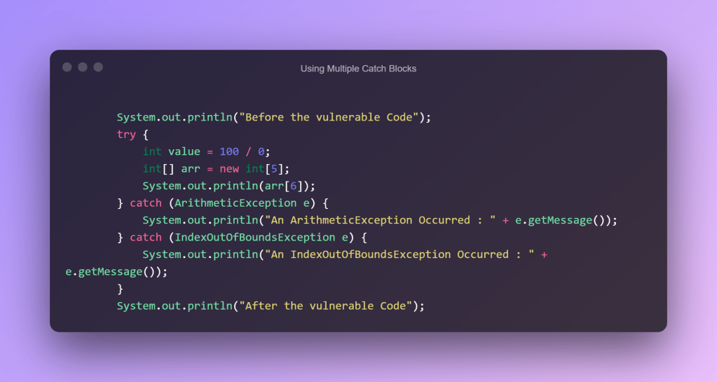 We can have multiple catch blocks for a single try block. We can execute different code blocks according the occurred exception.