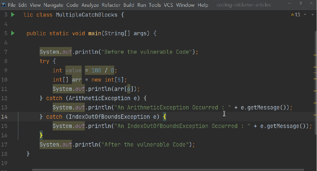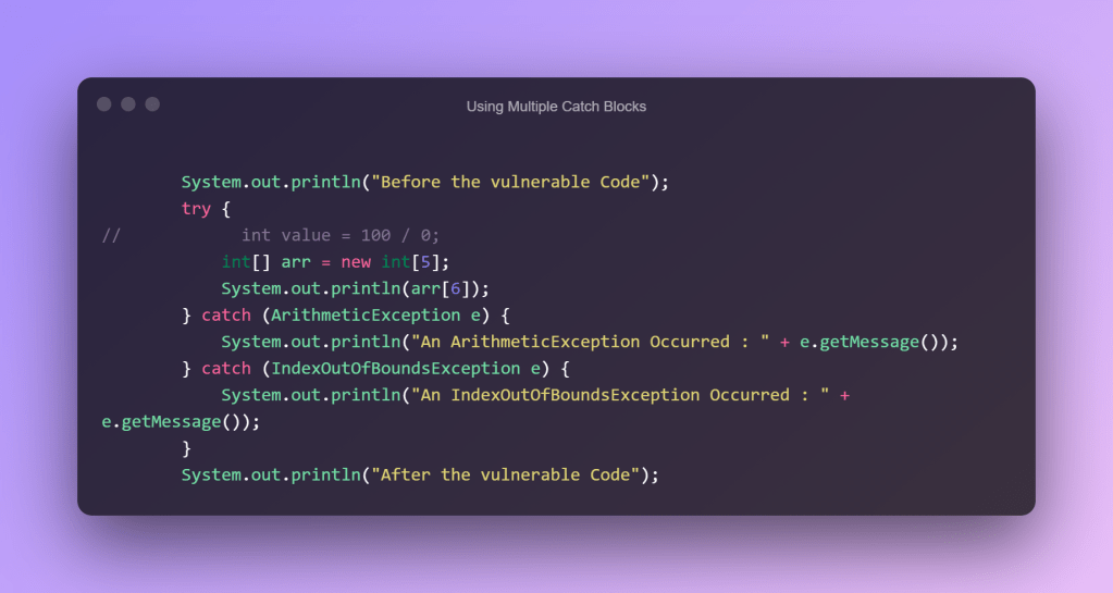 You can see that since an ArithmeticException occurs, the relevant catch block gets executed. Let’s comment out and see what happens.
