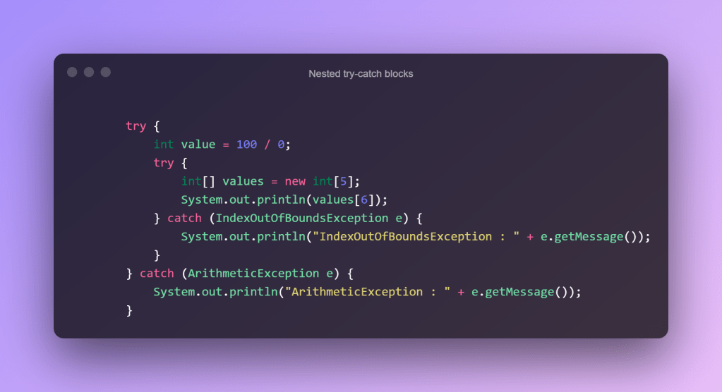 Using nested try-catch blocks are a bit debatable. Some programmers argue that it is not a good coding practice. Anyway, I don’t see anything inherently wrong with nested try-catch blocks. If you are interested, do some research before using them.